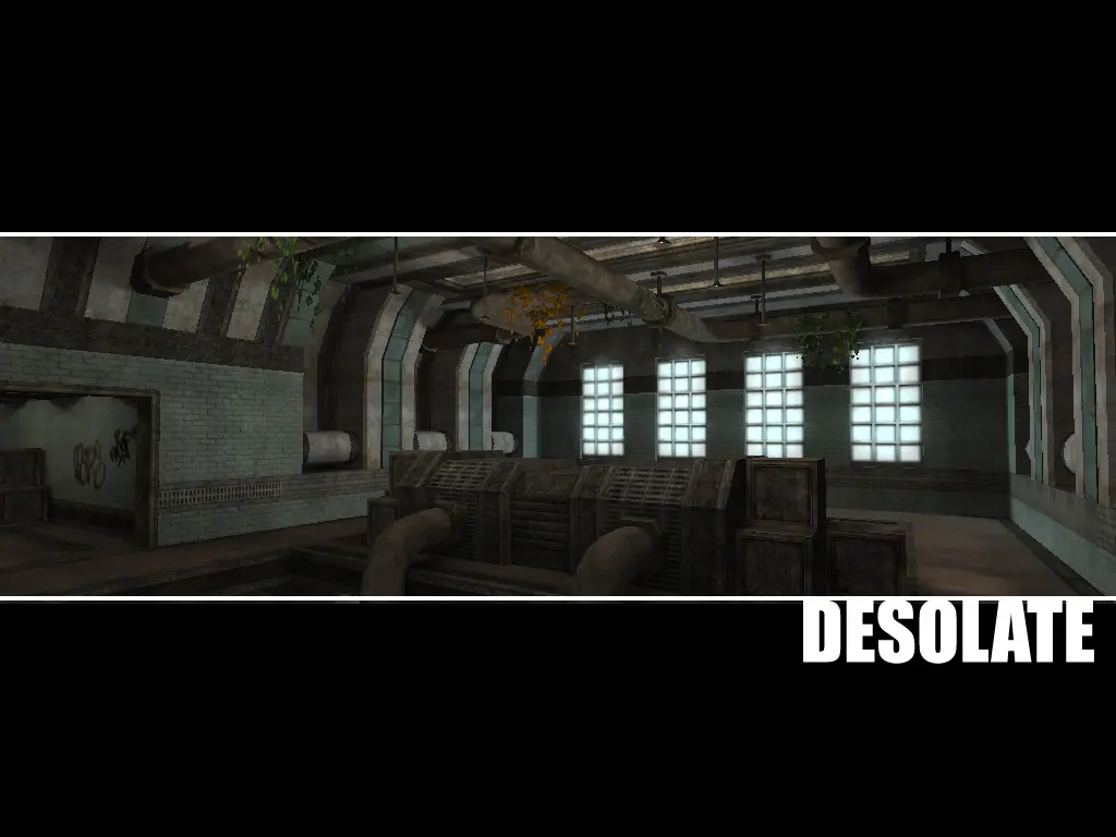 Desolate is a map set in an abandoned factory. It was inspired by the work of Motts at www.opacity.us.